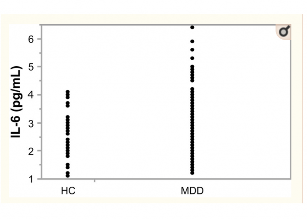In this graph, blood was taken from healthy controls (HC) and patients with Major Depressive Disorder (MDD). Levels of IL-6 were measured. On average patients with depression had more IL-6