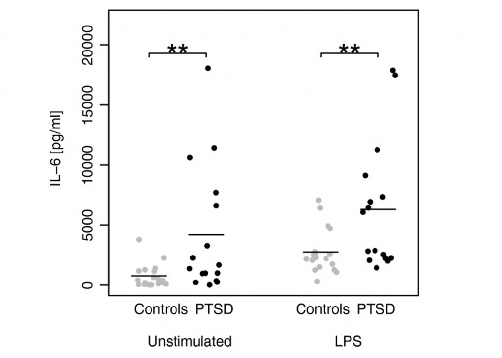 Blood was taken from healthy controls and PTSD patients. IL-6 was measured in unstimulated and stimulated (LPS) blood. IL-6 was higher in PTSD patients regardless of stimulation.