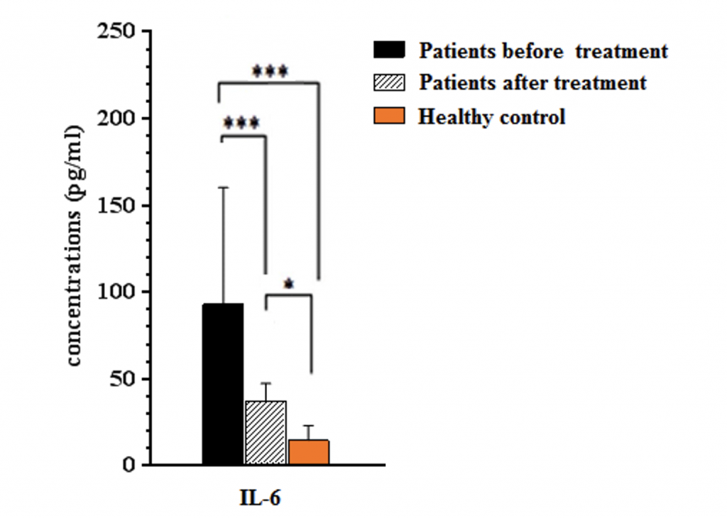 Blood was taken from patients with schizophrenia before and after treatment with mood stabilizing drugs and after as well from healthy controls. IL-6 was highest before treatment and was significantly reduced after treatment. Healthy controls had the lowest IL-6.